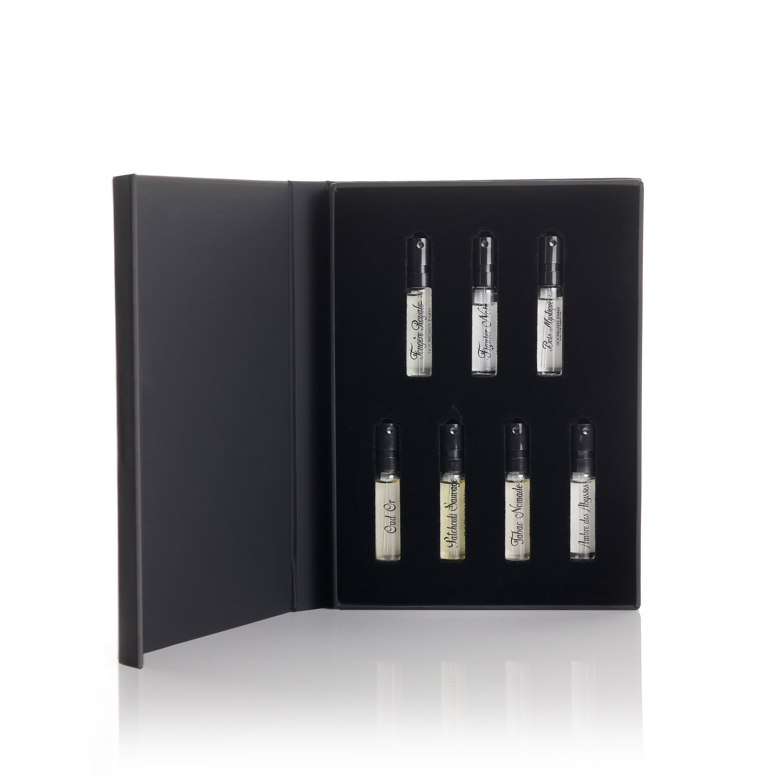 В набор DISCOVERY KIT входит: Парфюмерная вода Fougere Royale 2 мл; Парфюмерная вода Figuier Noir 2 мл; Парфюмерная вода Bois Mystique 2 мл; Парфюмерная вода Ambre des Abysses 2 мл; Парфюмерная вода Patchouli Sauvage 2 мл; Парфюмерная вода Tabac Nomade 2 мл; Парфюмерная вода Oud Or 2 мл.
