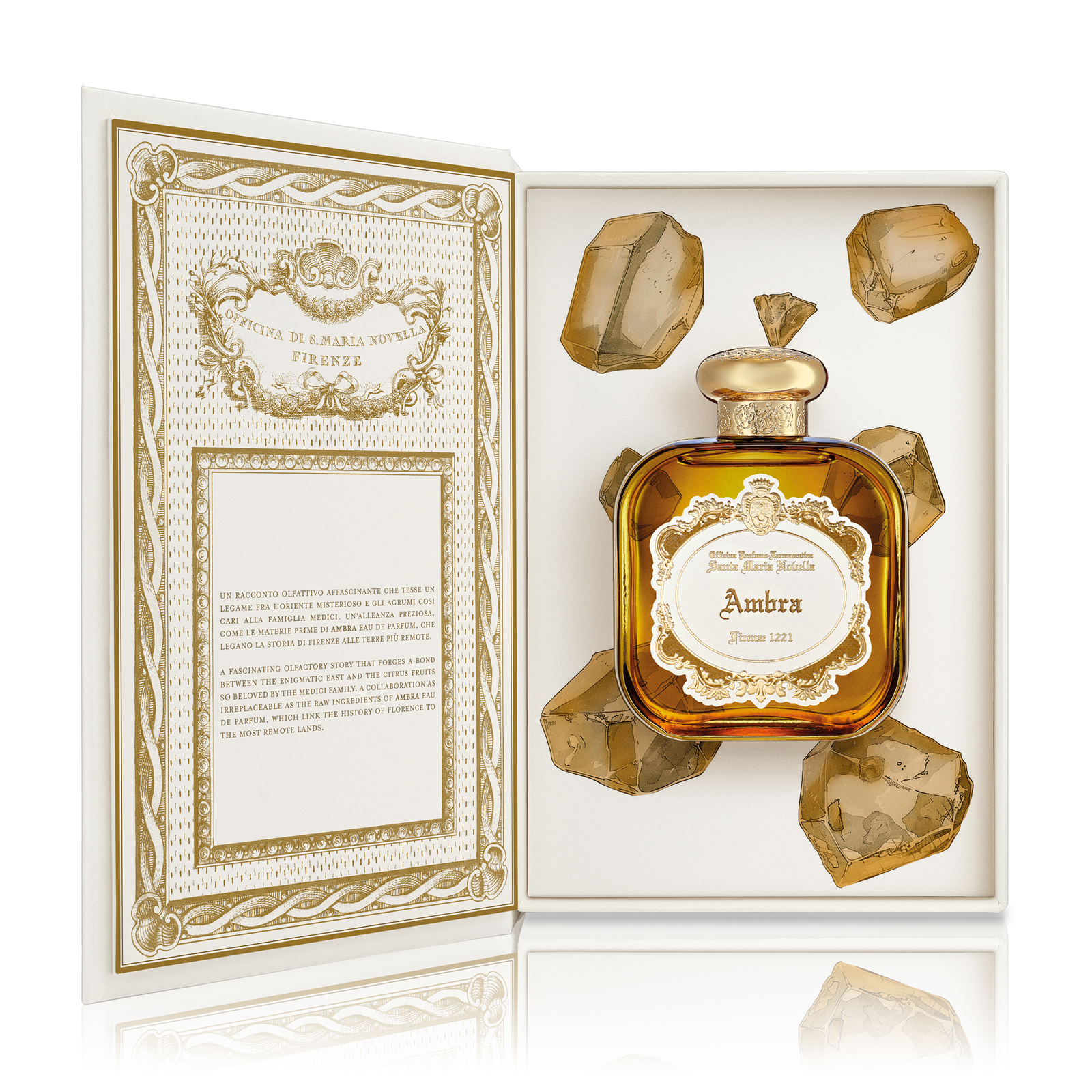 Мост между Востоком и Западом, Ambra сочетает яркие цитрусовые ноты с теплыми нюансами амбры, вызывая в памяти атмосферу зимнего сада при дворе Медичи. Очаровательная ароматная история, которая связывает историю Флоренции с самыми далекими землями.
